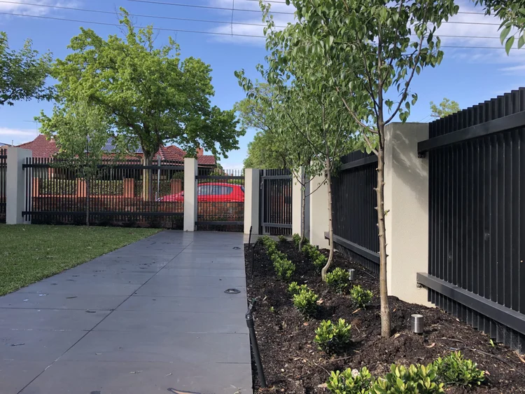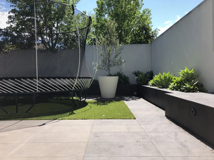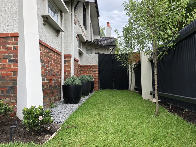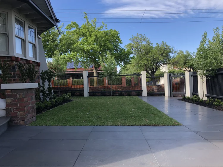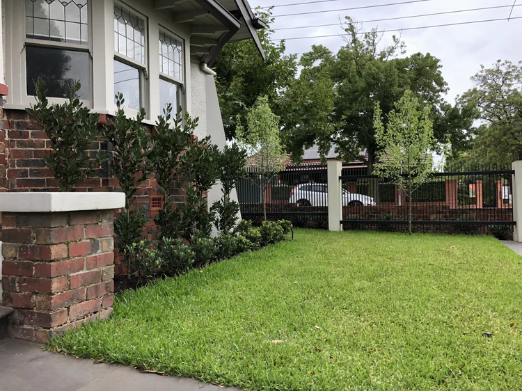 Our client was adamant about having a seamless transition from the existing heritage front home to the new garden and we succeeded in this by carefully selecting a softscape design and the use of advanced plants. The light in this front garden perfectly filters through the advanced Snow Pears to give the ideal playing environment for a young family.